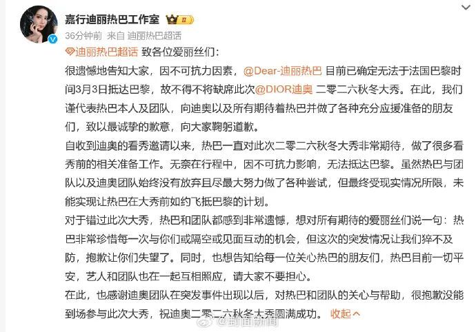 3月3日,@嘉行迪丽热巴工作室 发文称,因不可抗力因素,@Dear-迪丽热巴 目前已确定无法于法国巴黎时间3月3日抵达巴黎,将缺席时装周。工作室称热巴目前一切平安,艺人和团队也在一起互相照应,请大家不要担心。